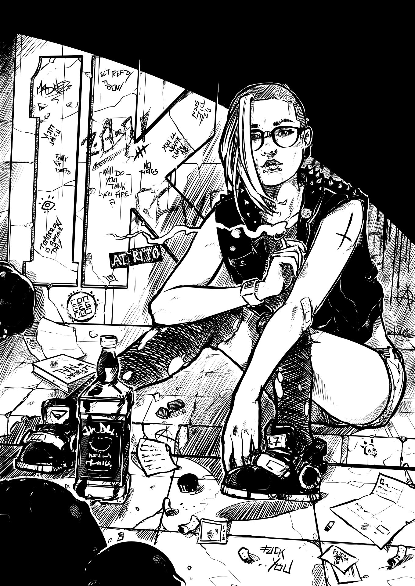 I consider this a bonus to the SMOKE AND RAIN, SPRAY AND MARKERS, and STREETS AND WORDS series. there’s the usual Attrito sticker in the back, but there’s also a reference to the Congegno band, another one of my favorites. the book on the ground is