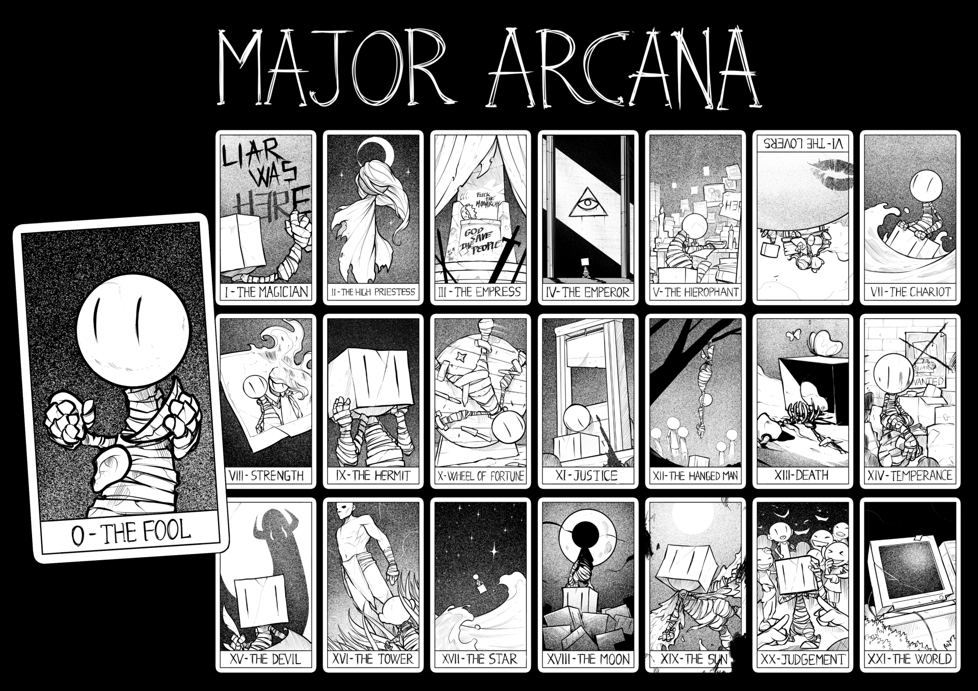 this is a list of all the major arcana cards in the Liar tarot deck. open a link to see the image and Liar’s interpretation of the card